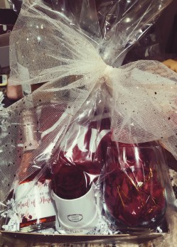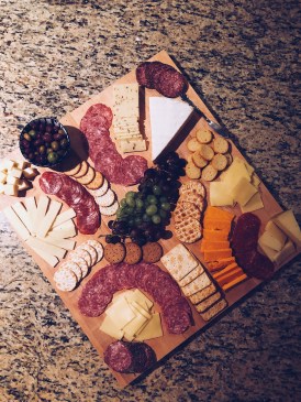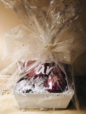 After spending quite a bit of time elbow deep in shredded paper, glitter tulle ribbon and cellophane with my mom and sister, the baskets were created. I set out snacks, made a cheese board and kept the wine flowing as the girls arrived for the night.
