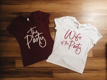 - Shirts (inspired by the cards) that say “Wife of the Party” for me and “The Party” for the bridal party